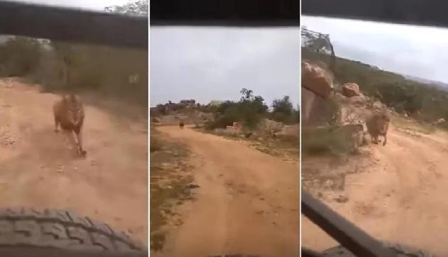 जब अचानक गाड़ी का पीछा करने लगा शेर, अटक गई लोगों की सांसें, वीडियो वायरल